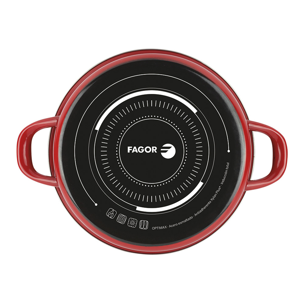 TARTERA OPTIMAX Ø26cm ROJA ACERO ESMALTADO AISI 430. ALTO ESPESOR DE ACERO CON 5 CAPAS DE RECUBRIMIENTO. ANTIADHERENTE DE DOBLE CAPA XYLAN PLUS. CERQUILLO DE ACERO INOXIDABLE. MANGOS ERGONOMICOS DE BAQUELITA TERMOAISLANTE. LIBRE DE CADMIO Y PFOA. 0,0% METALES PESADOS. APTO PARA TODO TIPO DE FUEGOS. APTO PARA HORNO. FAGOR Ø26x8cm (diámetro/alto)