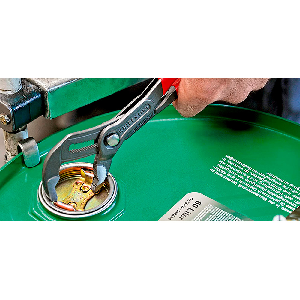 TENAZAS AJUSTABLES COBRA® 8701250 KNIPEX. AJUSTE AUTOMÁTICO MEDIANTE PULSACIÓN DE BOTÓN DIRECTAMENTE EN LA PIEZA DE TRABAJO. AJUSTE PRECISO PARA ADAPTARSE ÓPTIMAMENTE A DIVERSOS TAMAÑOS DE PIEZAS Y PARA UNA POSICIÓN ERGONÓMICA DEL MANGO AUTO-RETENCIÓN EN TUBERÍAS Y TUERCAS, AGARRE PERFECTO A LA PIEZA CON EL MÍNIMO ESFUERZO.MORDAZAS CON DIENTES ADICIONALMENTE TEMPLADOS, DUREZA APROX. DE LOS DIENTES 61 HRC: POCO DESGASTE Y GRAN SEGURIDAD EN EL AGARRE. 240x44x14mm