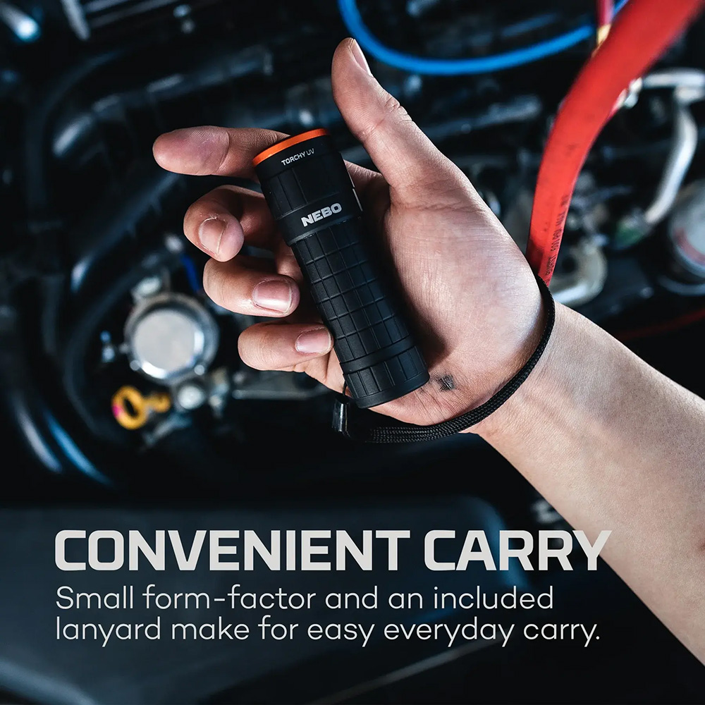 TORCHY UV. VEA LO INVISIBLE CON LA LUZ ULTRAVIOLETA Y NEGRA DE TORCHY. DISEÑADA CON TECNOLOGÍA UVA DUAL (ULTRAVIOLETA A) PARA UNA MEJOR DETECCIÓN, INSPECCIÓN Y AUTENTICACIÓN EN APLICACIONES RESIDENCIALES Y COMERCIALES. LAS LONGITUDES DE ONDA DE AMPLIO ESPECTRO PROPORCIONAN UNA ILUMINACIÓN Y FLUORESCENCIA COMBINADAS QUE RESULTAN IDEALES PARA TAREAS DE CORTO ALCANCE COMO LA DETECCIÓN DE ORINA DE MASCOTAS, LA INSPECCIÓN DE FUGAS EN AUTOMÓVILES CON TINTES UV, LA DETECCIÓN DE PLAGAS COMO ESCORPIONES, LAS INSPECCIONES DE LIMPIEZA Y LA AUTENTICACIÓN DE MONEDA. COMPACTA Y DE BOLSILLO, ESTA LINTERNA ESTÁ FABRICADA CON UNA CARCASA DE ALUMINIO DURADERO RESISTENTE A LOS GOLPES Y AL AGUA. FUNCIONA CON TRES PILAS AAA (INCLUIDAS). TECNOLOGÍA UV-A DUAL (2x395nm + 1x365nm LED) – PILAS ALCALINAS (3xAAA) – 2 MODOS DE LUZ (ALTA – BAJA) – FUNCIONAMIENTO MEDIANTE PULSADOR – CONSTRUCCIÓN DE ALUMINIO – RESISTENTE AL AGUA CLASIFICACIÓN IPX4. NEBO