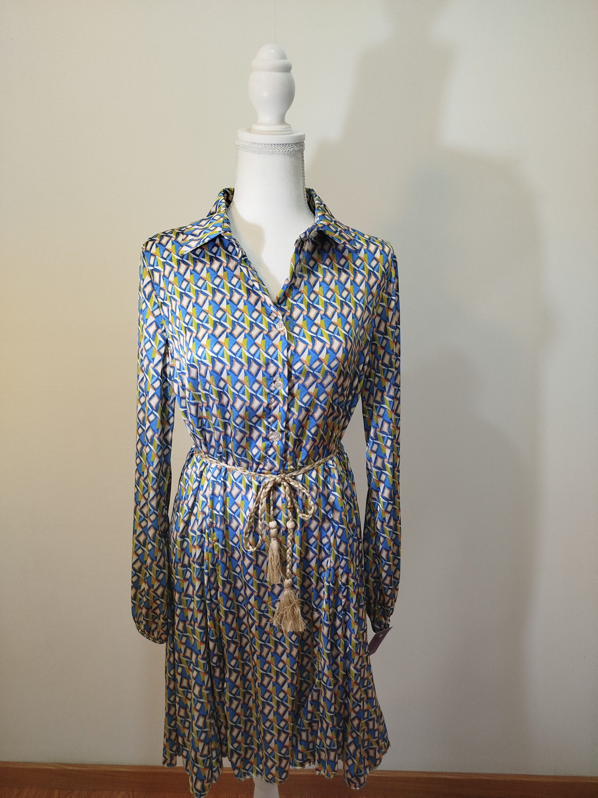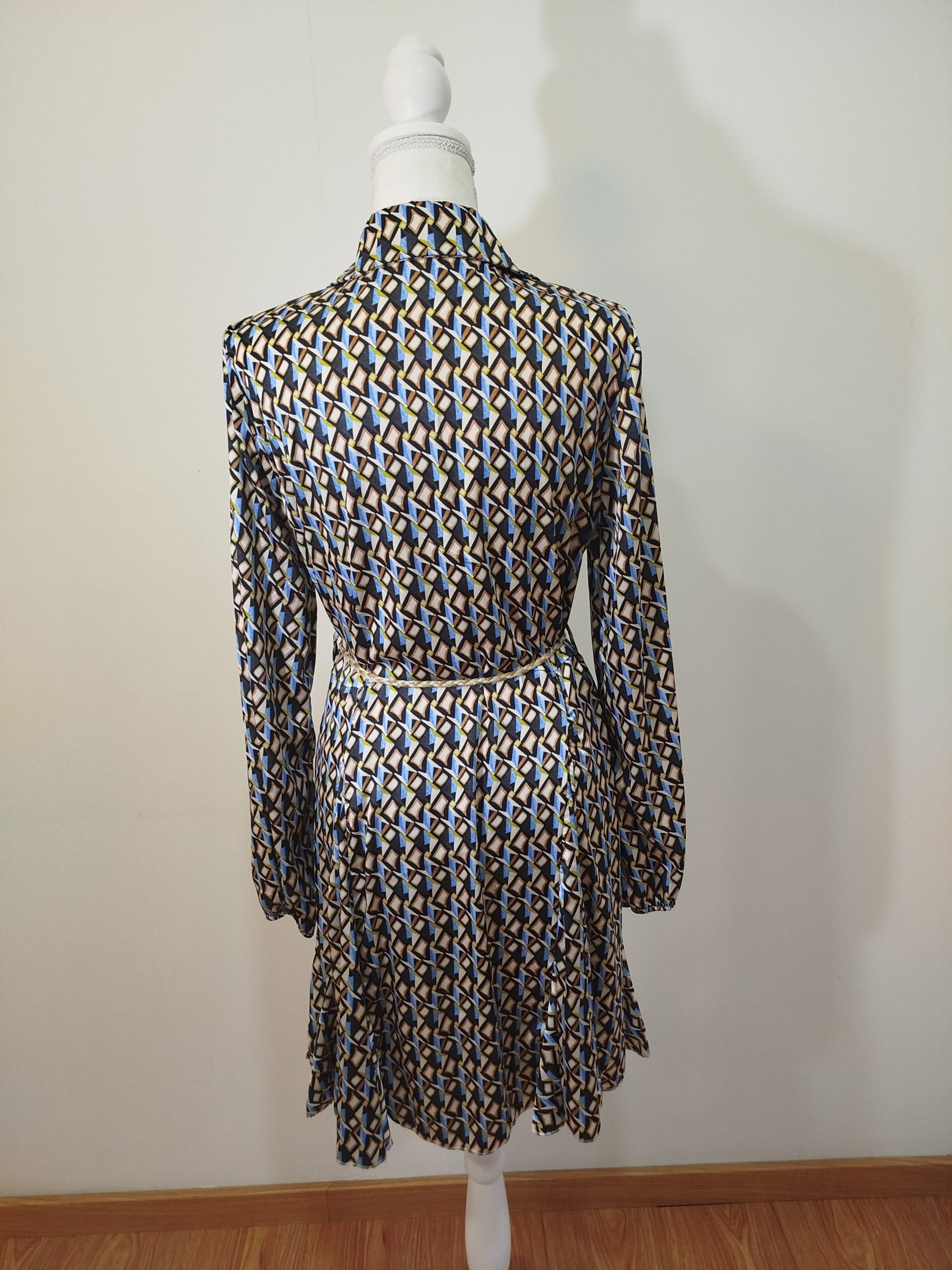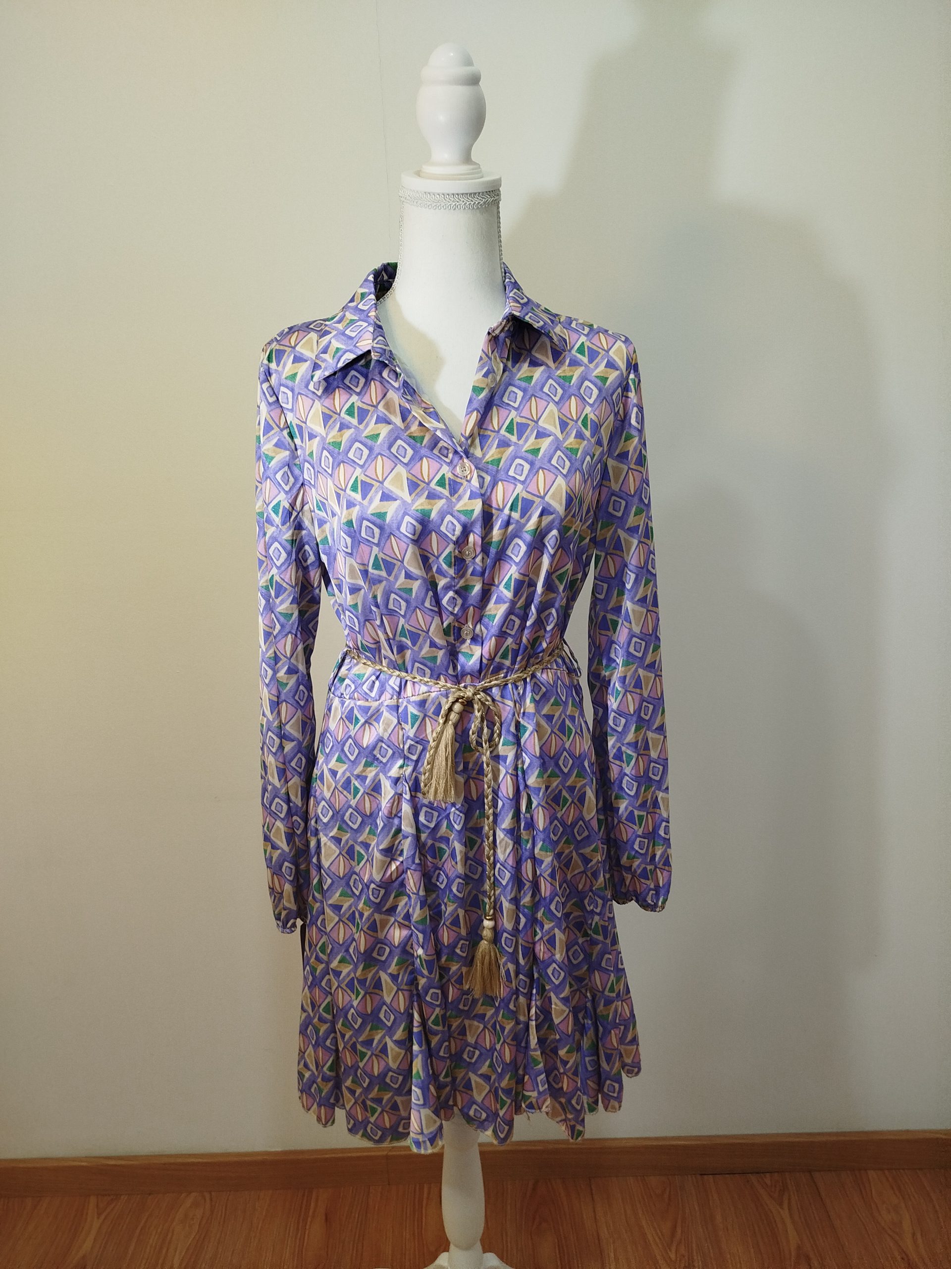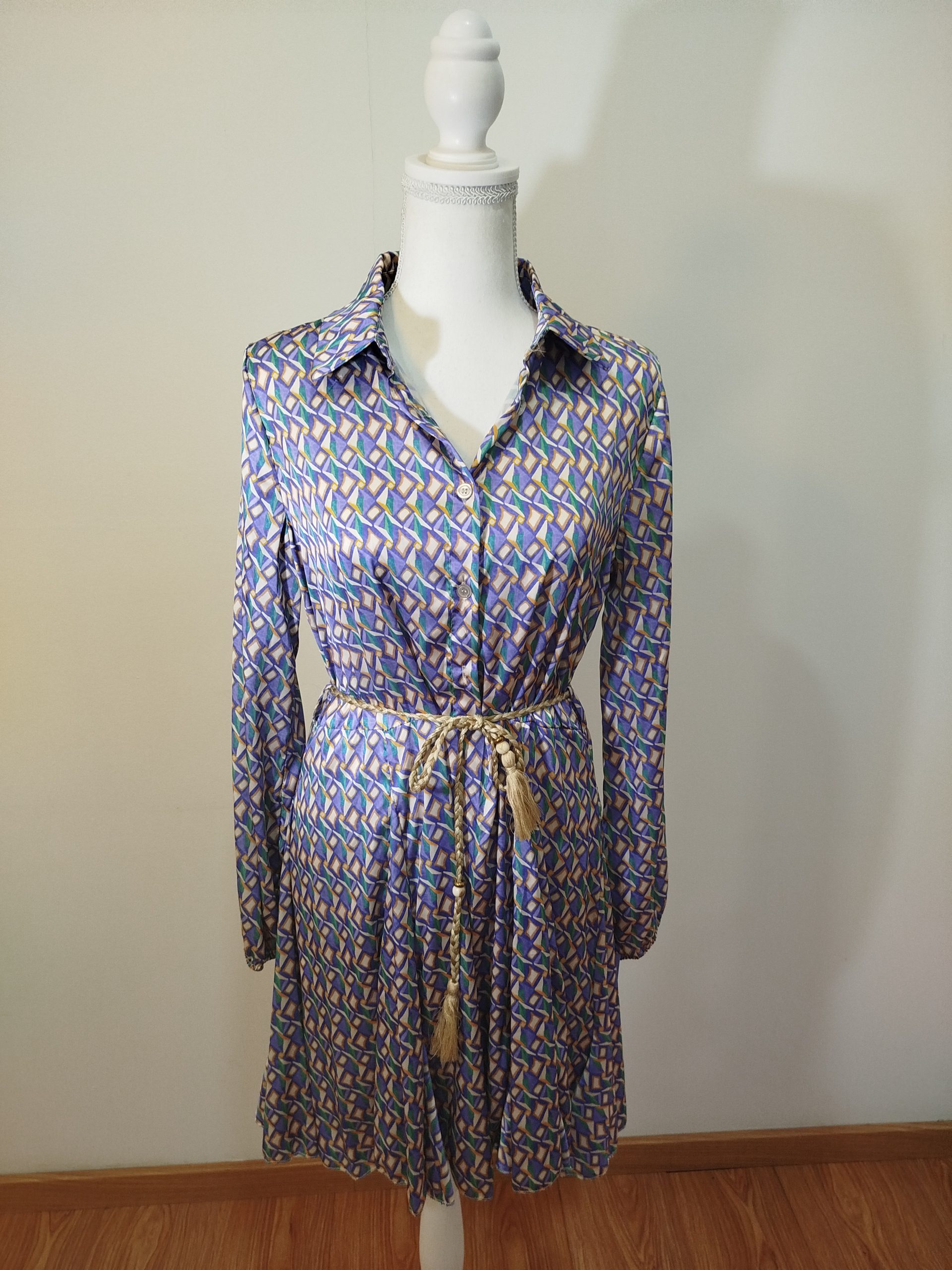 Vestido con falda de vuelo botones delanteros solapa en el cuello de camisa y cinturon, con elastico en la cintura que da ajuste.