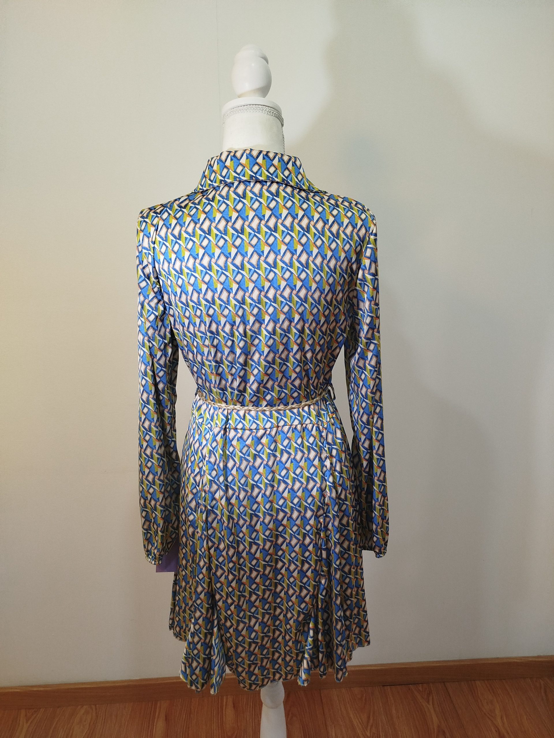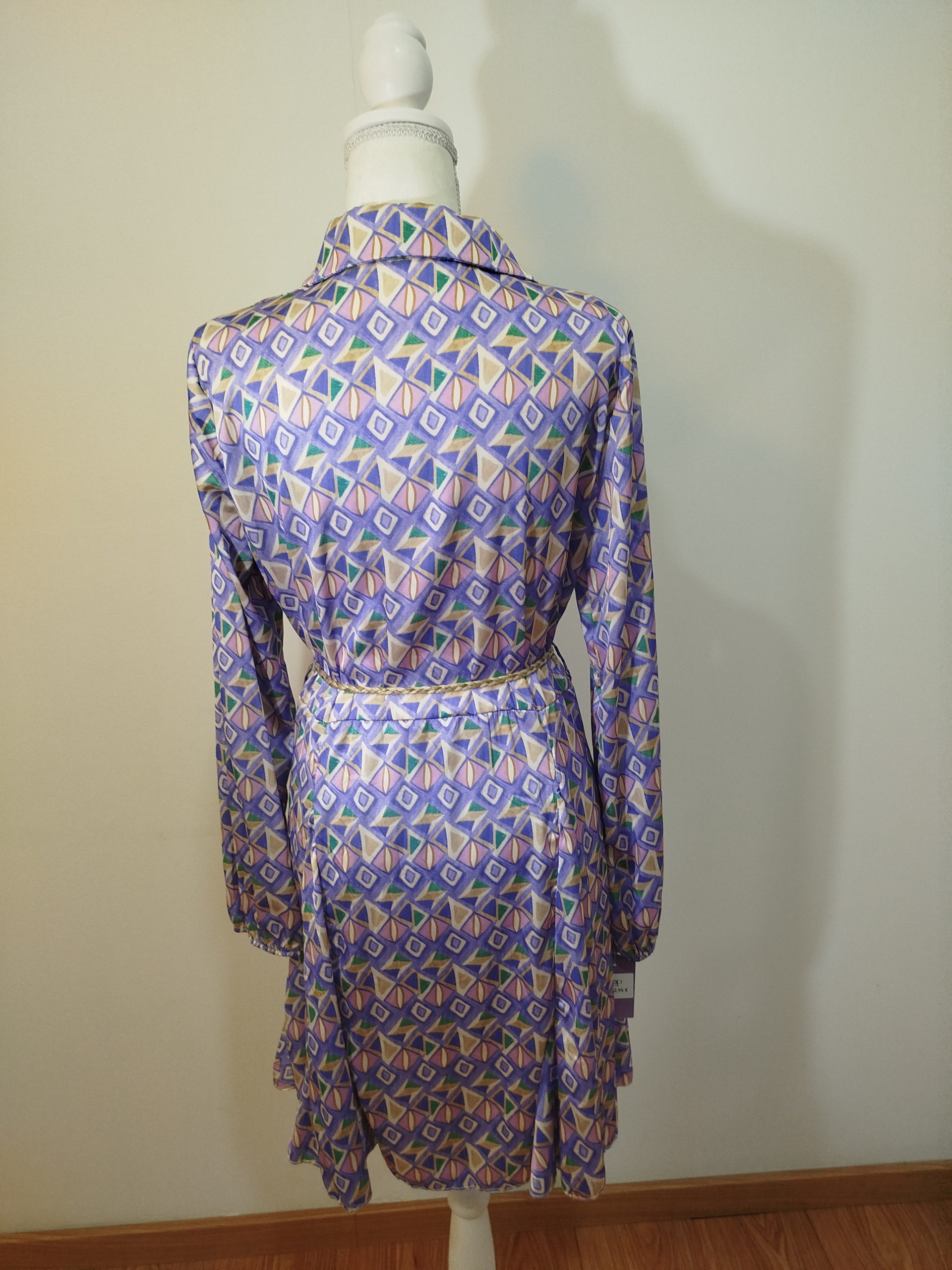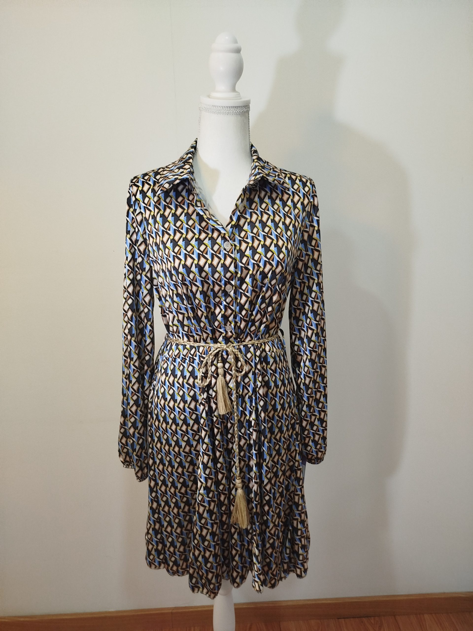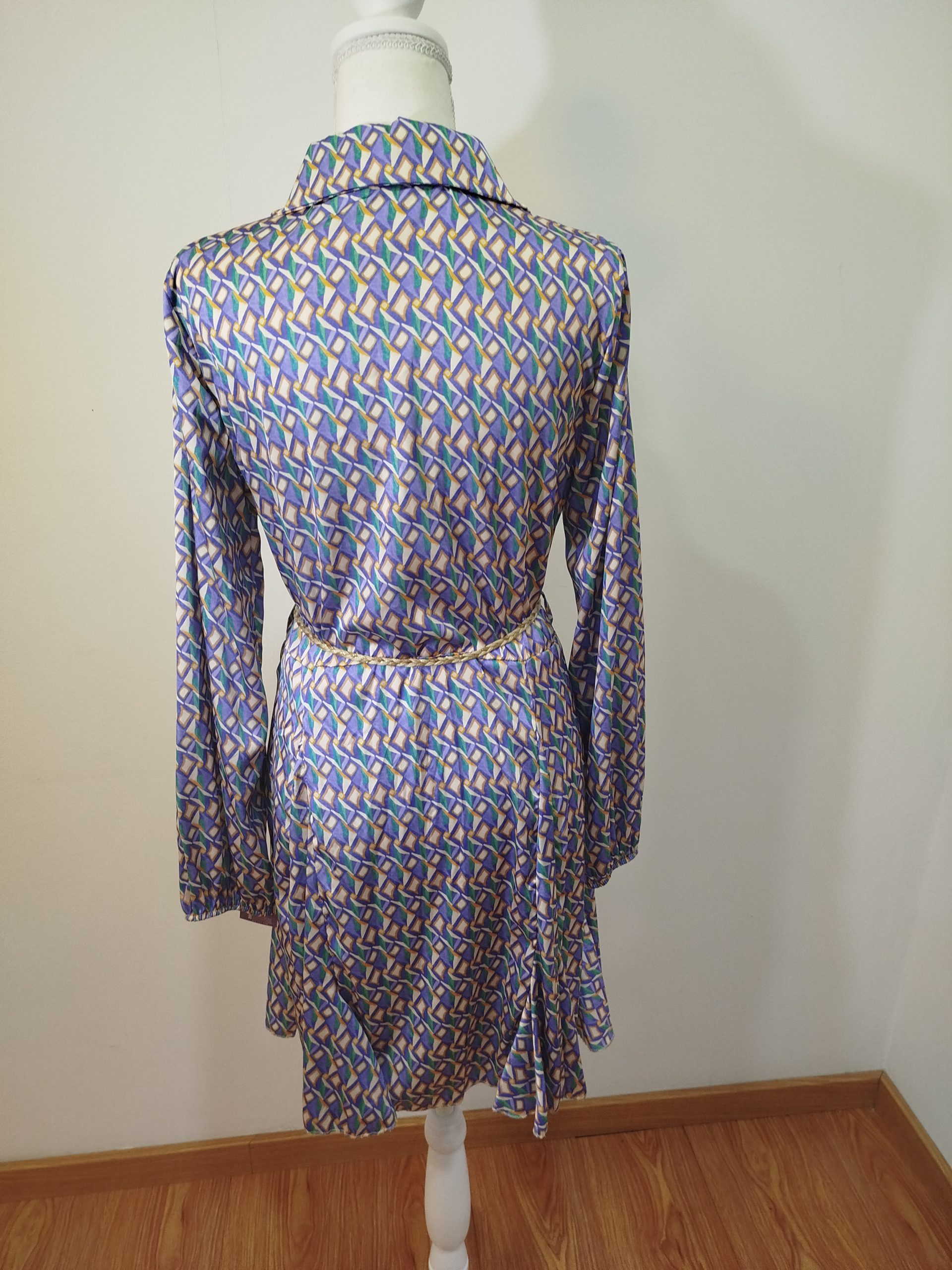 Vestido con falda de vuelo botones delanteros solapa en el cuello de camisa y cinturon, con elastico en la cintura que da ajuste.